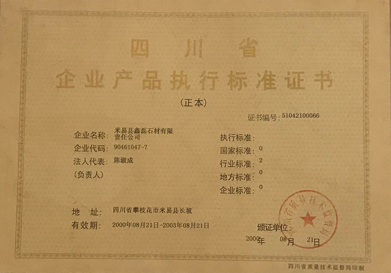 • 四川省企業(yè)產(chǎn)品執(zhí)行標(biāo)準(zhǔn)證書(shū)